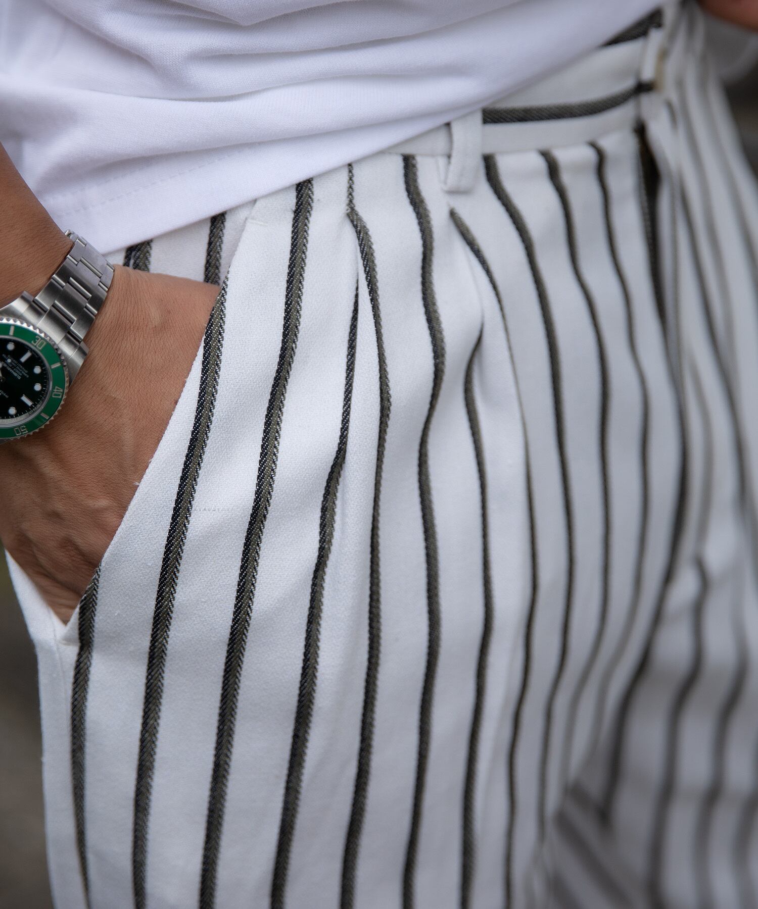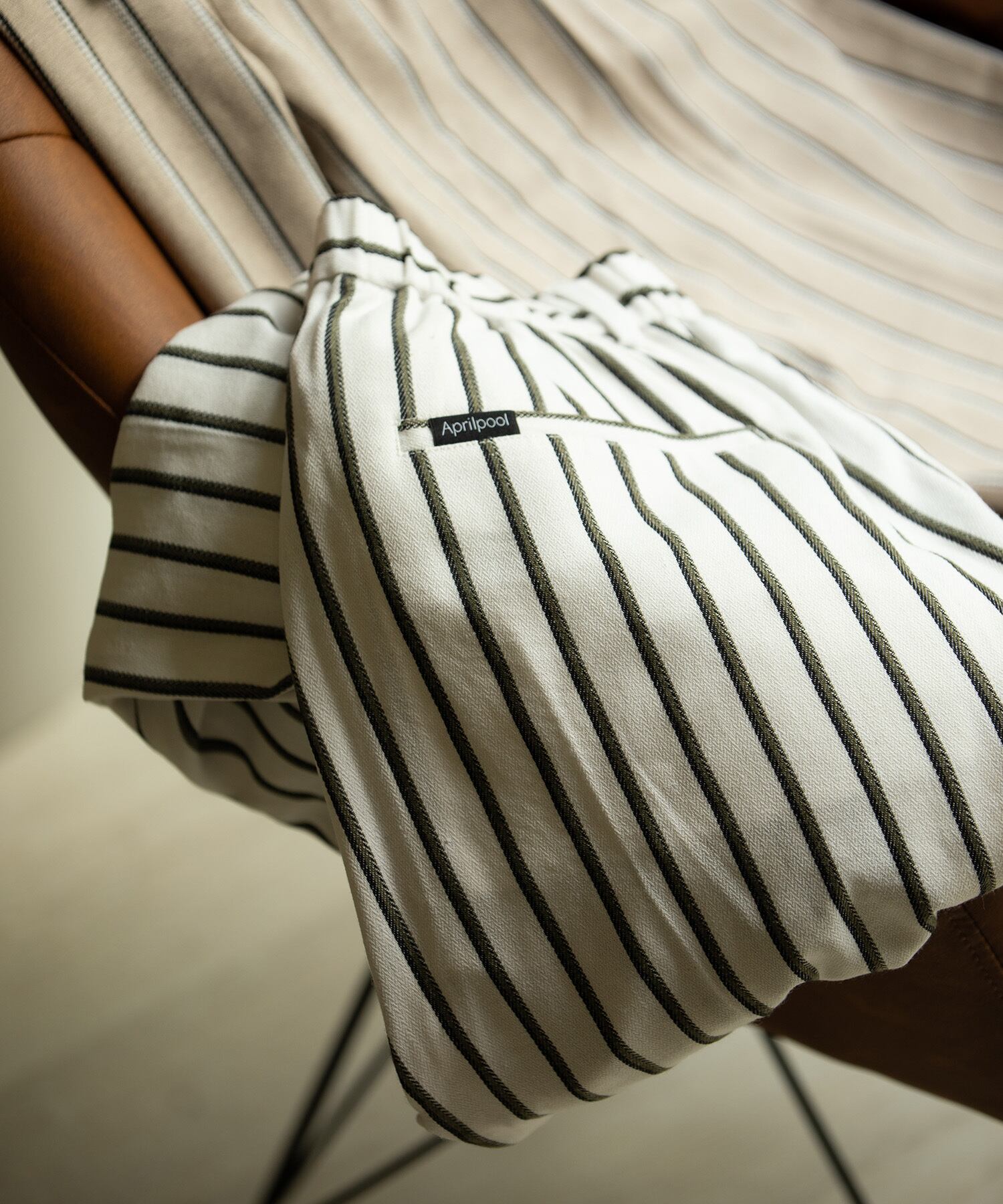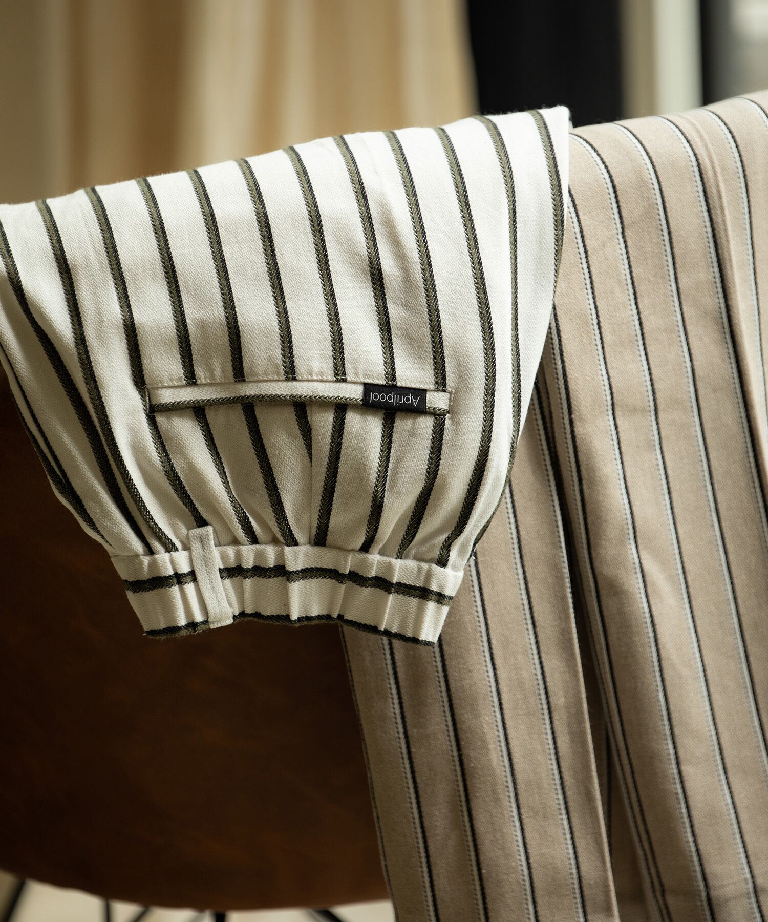 ・上品な細身のストライプ柄に、リラックス感のあるコットンリネン生地を使用したリゾートパンツ。